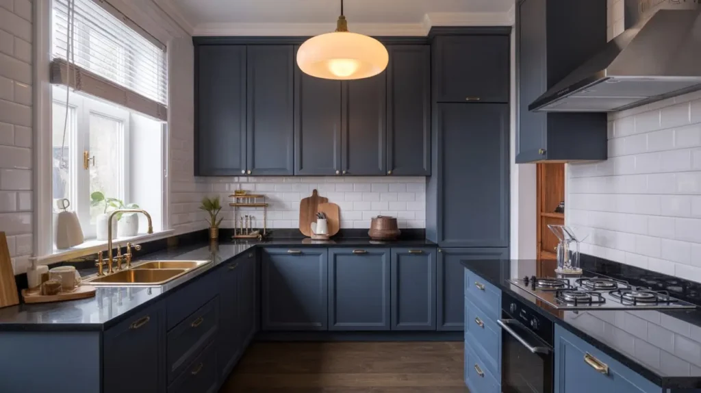 8. Navy Blue Cabinets Paired with Black Granite