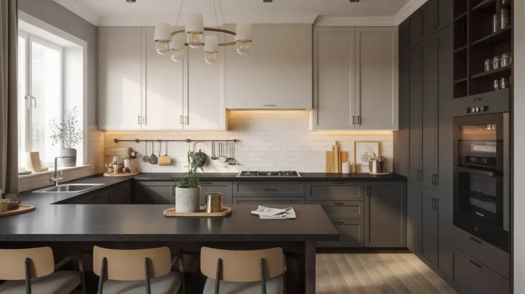 - Introduce Warmth: A monochromatic grey and black scheme can feel a bit cold. Bring in warmth through wood accents—a butcher block island section, wooden open shelves, or warm-toned flooring are essential.