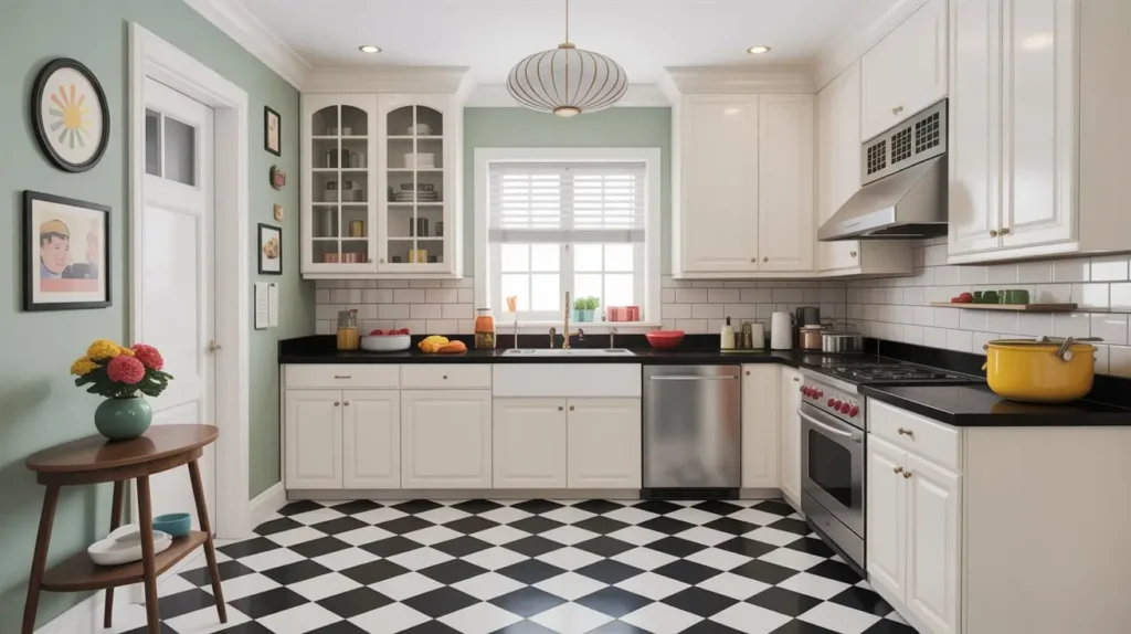 Ready to have some fun? This combination is a bold, retro-inspired look that is full of personality. A classic black-and-white checkered floor paired with solid black countertops creates a graphic, high-energy kitchen with a nostalgic twist.