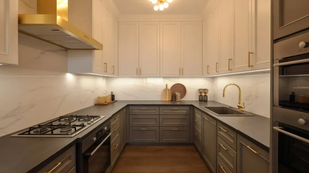 - Tie it Together: Use hardware to link the two cabinet colors. For example, if you have a navy island and white cabinets, use the same brushed brass pulls on both.