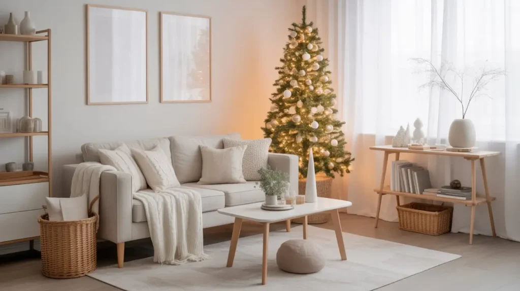 Scandi style is the best friend of the small apartment dweller. The Scandinavian philosophy centers on light, nature, and “hygge” (coziness). When you decorate with neutrals, you avoid the visual chaos that traditional bright red and green can sometimes cause in a small room.