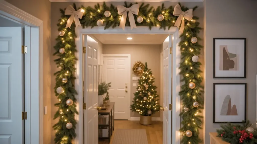 For a modern look, don’t make the garland perfect. Let it hang longer on one side. Weave in a velvet ribbon in a deep burgundy or forest green. The doorway is usually the first thing you see; dressing it up sets the tone for the whole apartment immediately.