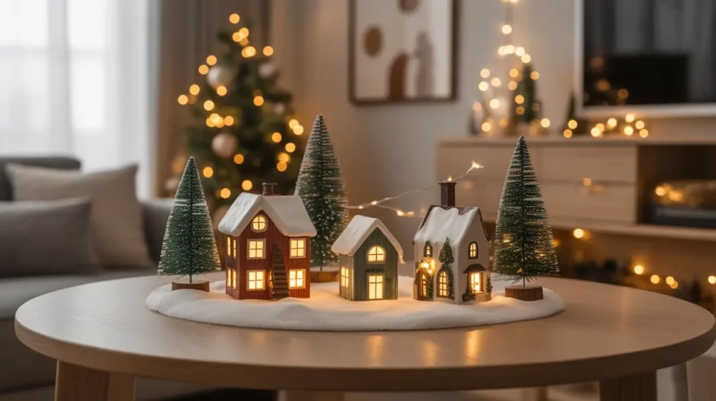 Cord management is a nightmare with tiny houses. I skip the plug-in lights entirely. Instead, I buy those tiny battery-operated tea lights and shove one inside each house. It creates that warm, lived-in glow without a tangle of wires ruining your shelf aesthetic.