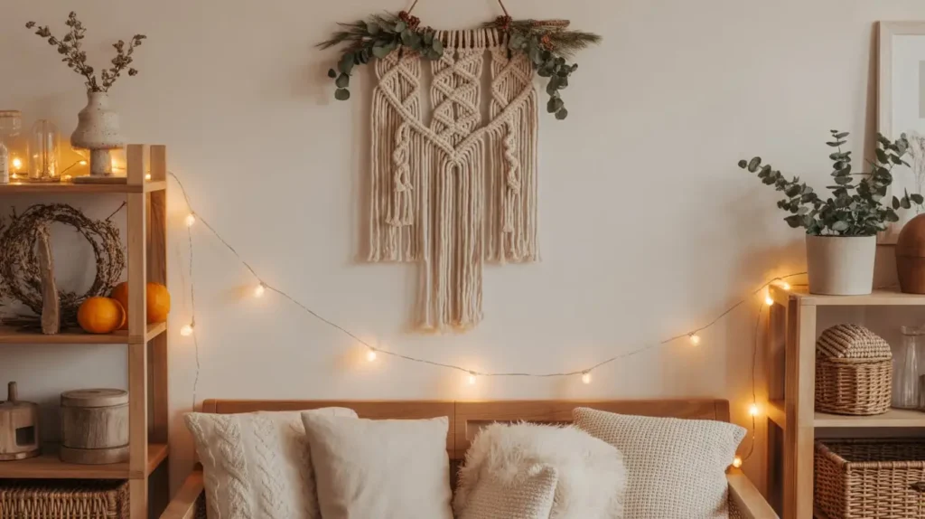 Take your existing woven wall hanging and weave a strand of micro-LED wire lights through the knots. Add a few sprigs of eucalyptus or pine into the weave. Suddenly, your year-round decor is festive.