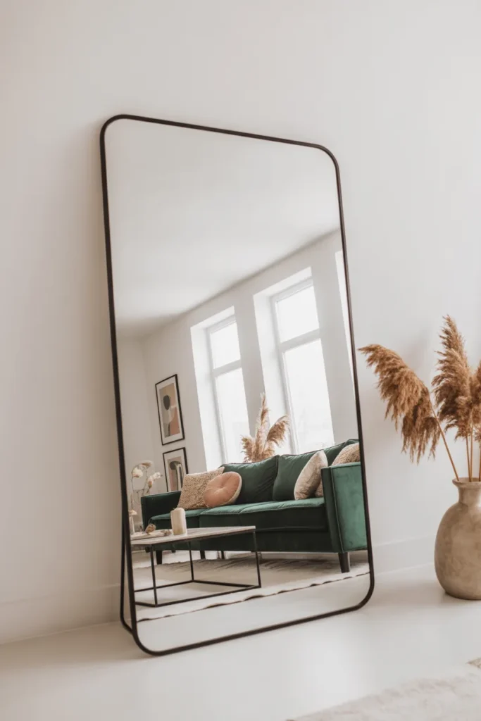 Here’s a little trick—mirrors don’t just reflect light, they reflect style. A tall mirror leaning against the wall instantly makes your space feel bigger and more styled.