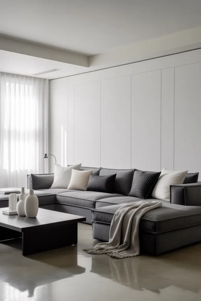 Instead of adding new colors, play with shades and textures. A light grey sofa, darker cushions, and a black table all work together without clashing.