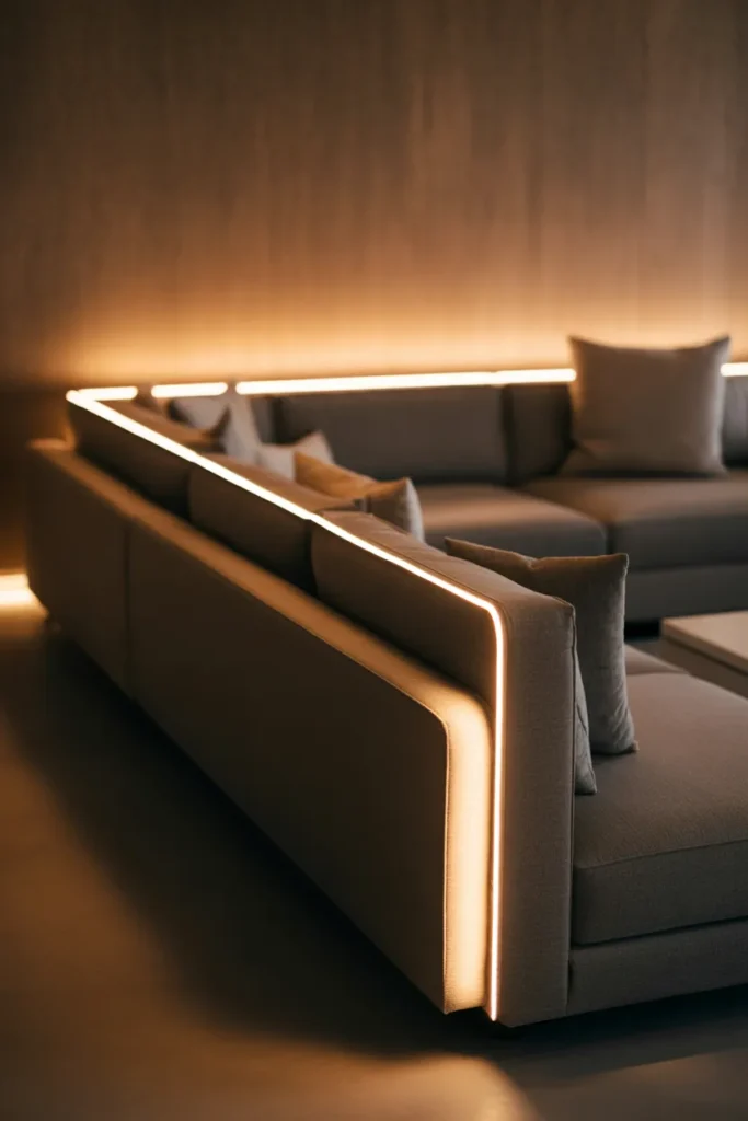 You don’t need anything complicated. Just run LED strips along the back edge of your couch or behind a wall panel, and suddenly your room feels like it belongs on Pinterest.