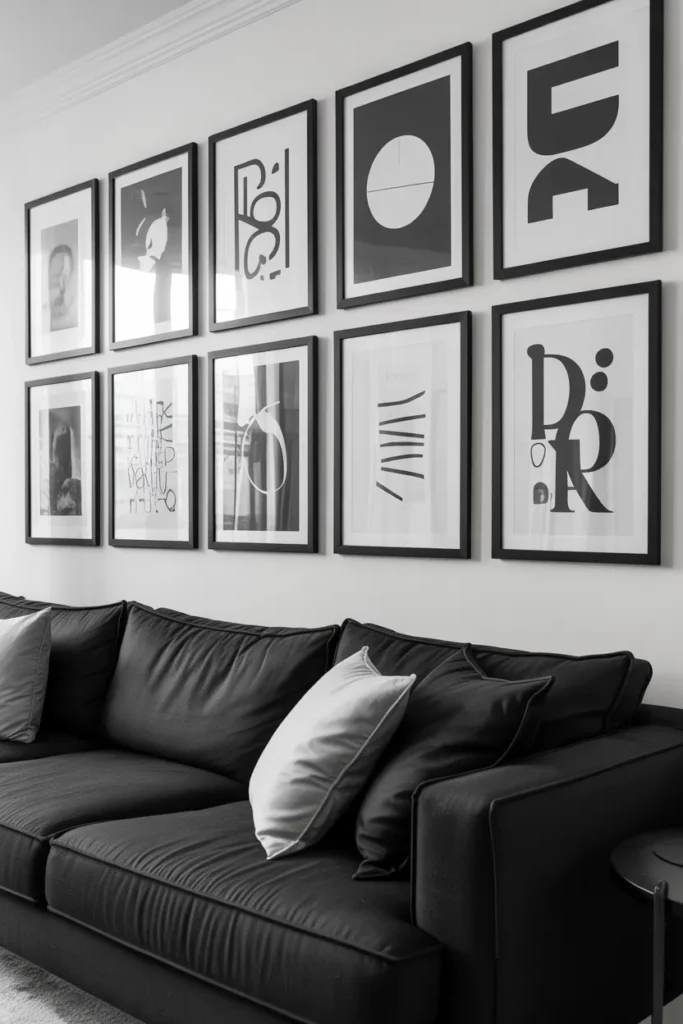 Not all gallery walls feel the same. A black-and-white one with bold prints or fashion-inspired art has a completely different energy—it’s confident and a little edgy.