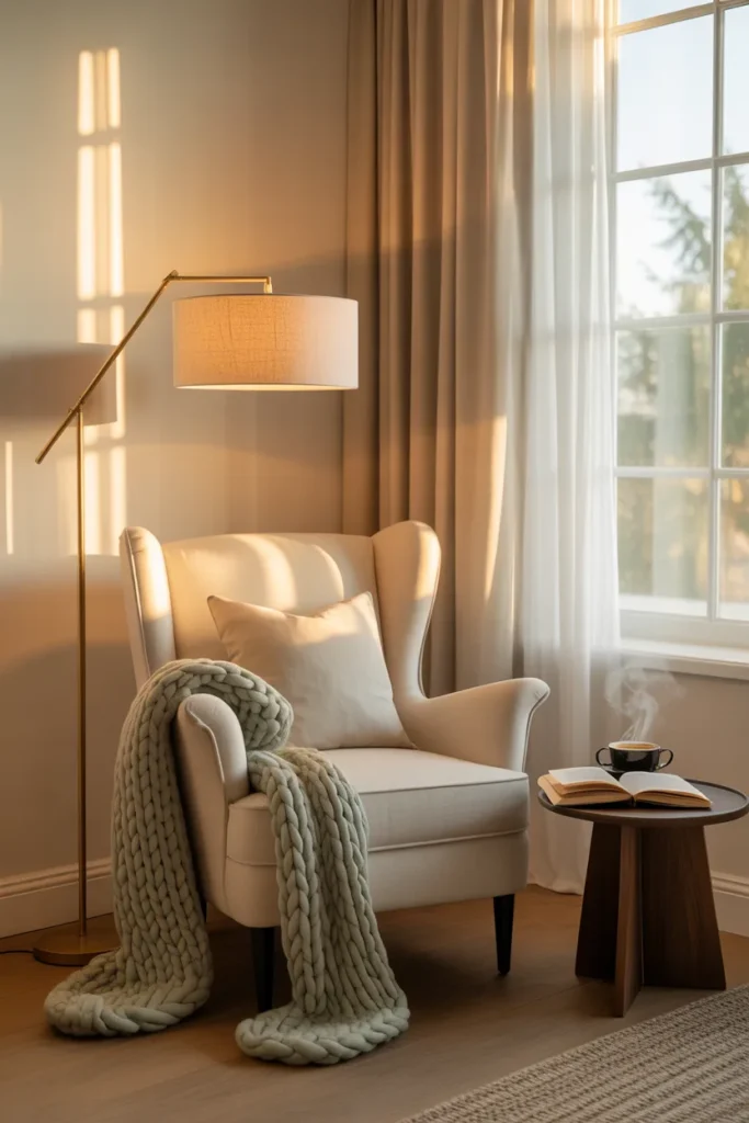 A chair, a soft throw, and a floor lamp in the corner instantly create that little escape. Place it near a window or a quiet wall where it feels slightly tucked away.