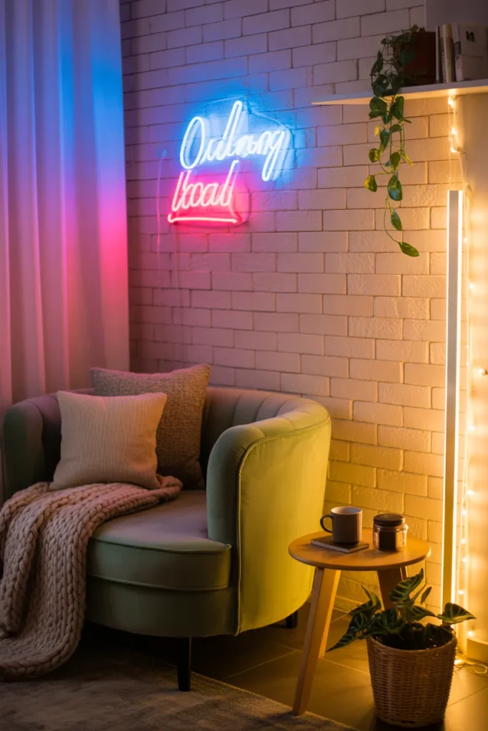There’s always that one corner in a living room that feels awkward or underused. A neon sign can completely transform it into something you actually want to look at.