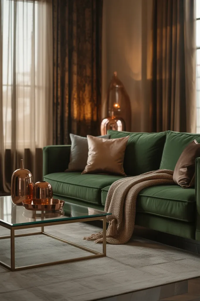 A deep-toned velvet sofa—think emerald, charcoal, or even muted mauve—becomes the anchor of your living room. Place it against your main wall, preferably where natural light hits slightly from the side so the texture really shows.