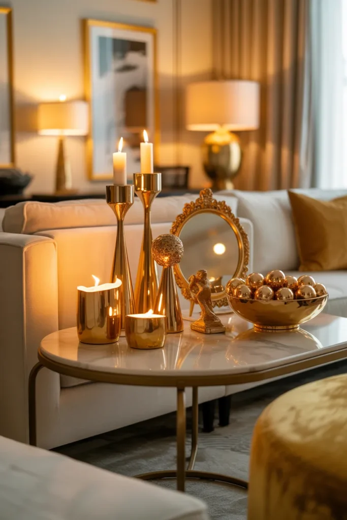 Honestly, I like to repeat gold in small ways across the room—maybe a frame on the wall, a candle holder on a shelf—so it feels intentional rather than random.