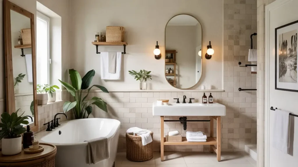 6. Warm Neutral Bathroom with Soft Black Fixture Details