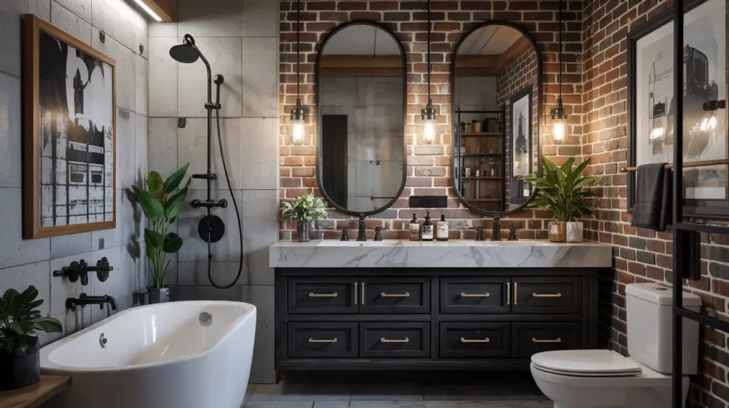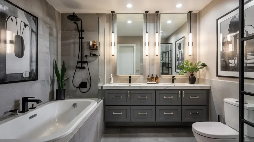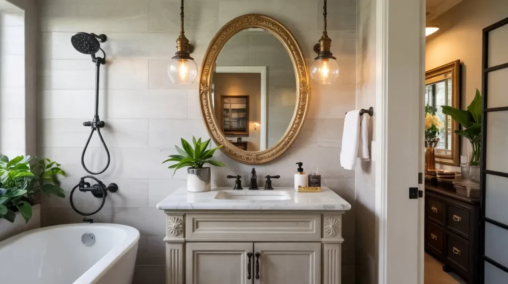 - Lighting: Use a dramatic pendant light in black wire or smoked glass instead of standard vanity lights.