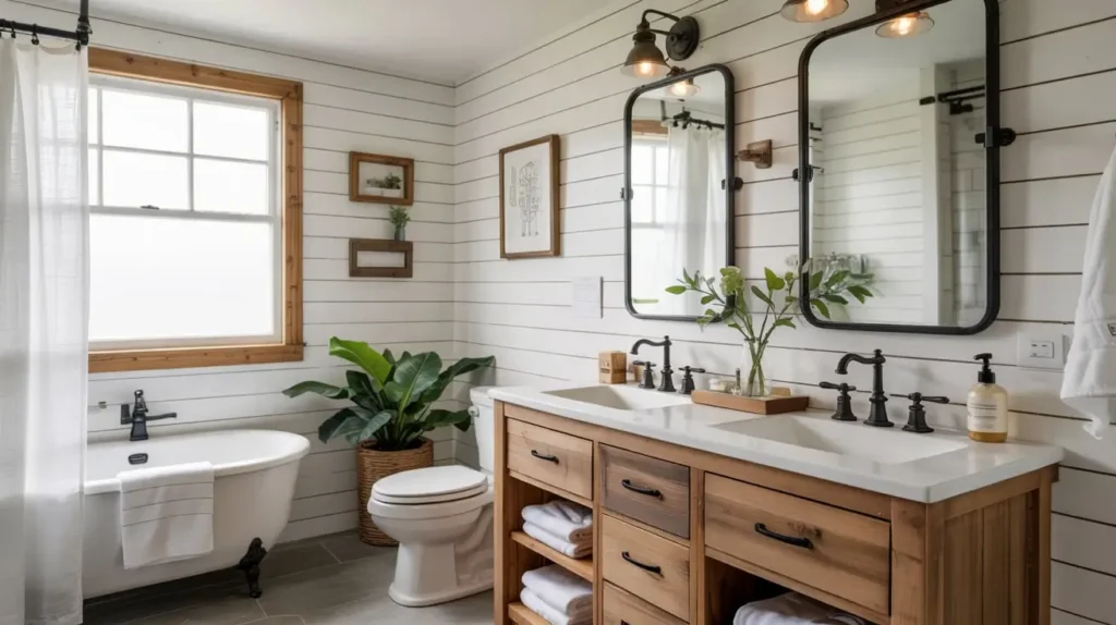 You keep the shiplap and the vintage silhouettes, but you ditch the oil-rubbed bronze (which looks dated and fake) for flat matte black. It takes the country vibe and drags it into the 21st century.