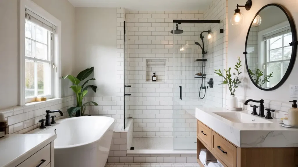 - Subway Tiles with a Twist: Don’t just slap up white subway tiles. Use black grout. This ties the wall design directly to your faucet and showerhead, creating a cohesive grid that looks intentional, not accidental.