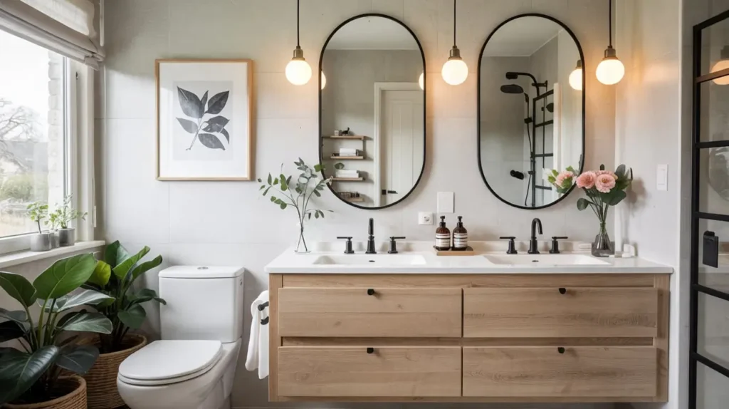 - Blonde Wood Tones: Use ash, maple, or white oak for the vanity or floating shelving. The pale wood softens the harshness of the black metal.