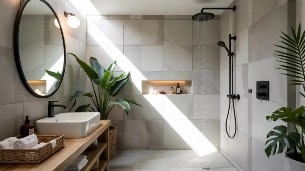 - Bamboo Accessories: A teak or bamboo shower bench pairs perfectly with black hardware.