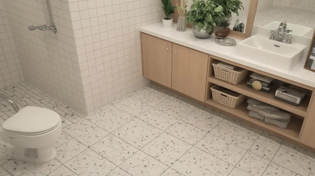 • Scale of the Chips: Pay attention to the scale of the “chips” in the tile. Large, chunky chips create a bold, graphic look that feels very retro-modern. Smaller, more densely packed chips create a more subtle texture. Choose the scale that best fits the size of your bathroom and your overall design vision.