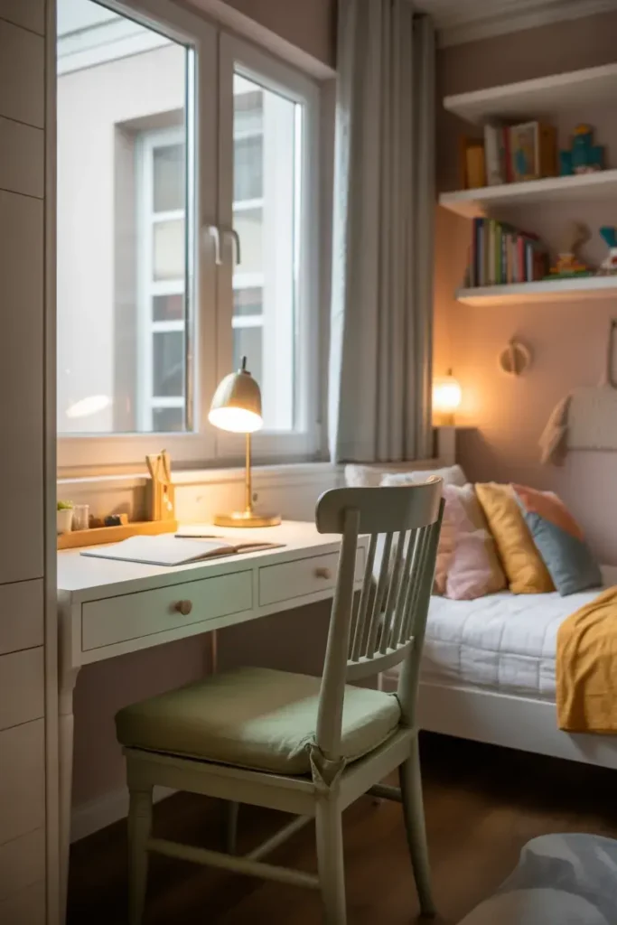 Picture a desk by the window, a comfy chair, and a small lamp that gives off warm light in the evening.
