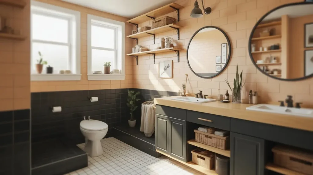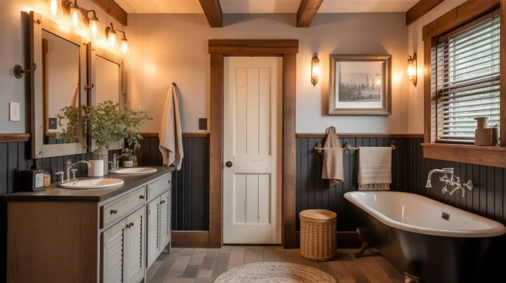 Think of raw, natural materials. I love using reclaimed wood for open shelving or the vanity base to bring in those tan, earthy notes. Then, you punch it up with black iron hardware. It’s gritty, authentic, and welcoming. The “tan” here isn’t paint; it’s the color of aged timber, burlap, and woven baskets.