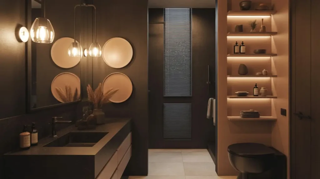 Layer your lighting. Use black pendant lights hanging low over a wood vanity for mood. Then, ensure you have recessed lighting (cans) in the ceiling to actually light the room up when you’re cleaning or doing makeup.