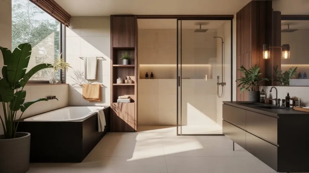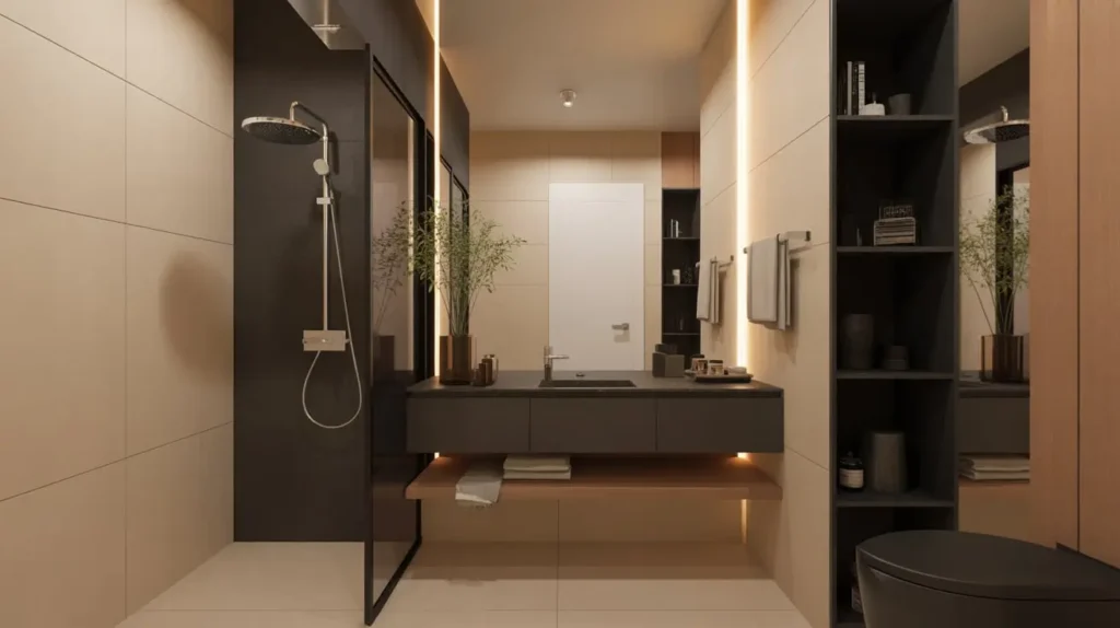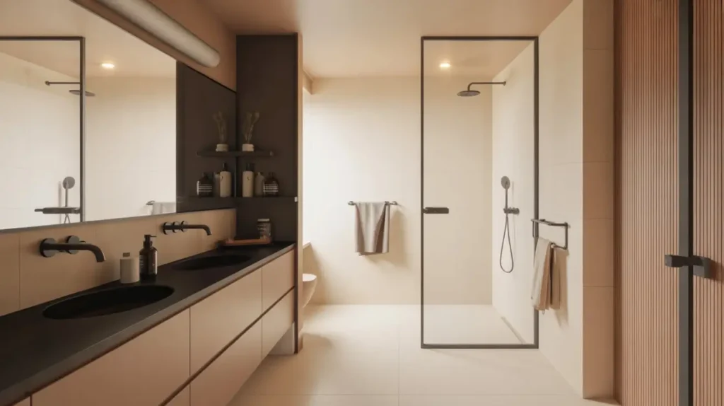 The key to nailing this look is restraint. You don’t need a thousand accessories cluttering the counter. You need clean lines and high contrast. Picture a sleek, floating vanity in a light oak (that’s your tan) set against a backdrop of large-format matte black wall tiles. The wood warms up the visual, preventing the black from feeling too heavy or oppressive.