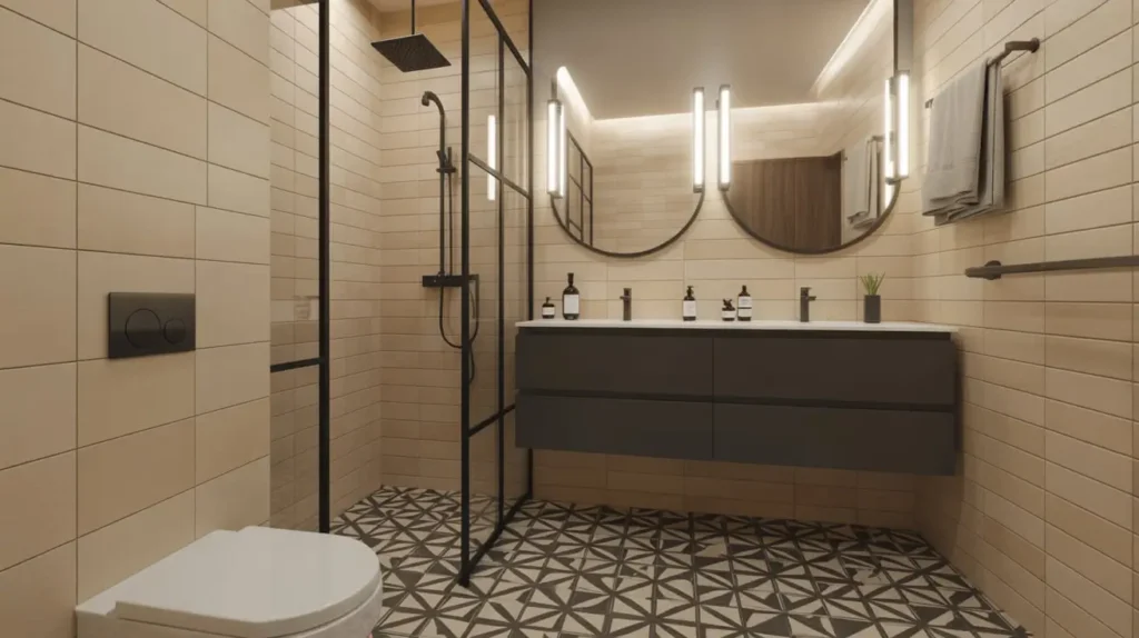 Inside the shower, use large format tan tiles on the walls to keep it bright and welcoming. Use a black hexagon tile on the shower floor for grip and contrast. This creates a distinct “wet zone” that looks intentional.
