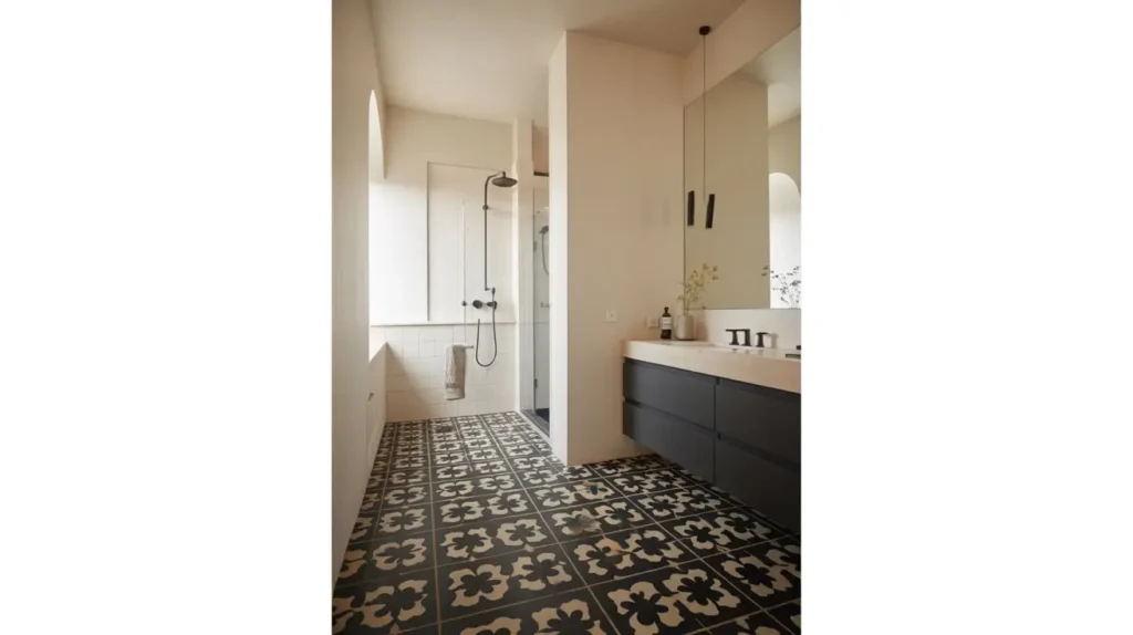 If you keep the walls simple, the floor can be the star. I mentioned geometric tiles earlier, but let’s talk about patterns specifically. Encaustic cement tiles often come in beautiful black and tan motifs. They feel soft underfoot and age beautifully.