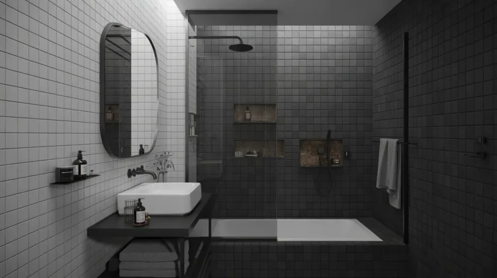 Do you want drama? Create a feature wall. This involves tiling one wall (usually behind the vanity or in the shower) with a bold black and white pattern or a solid black texture, while keeping the rest of the room neutral.