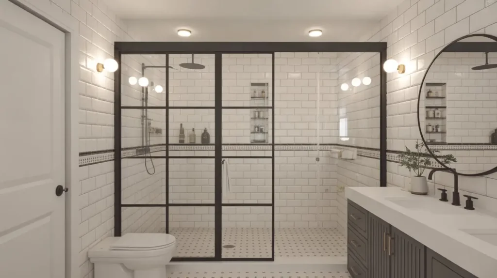 Keep your tile grout white or light grey here. You want the eye to go straight to the black metal accents, not the lines on the wall.
