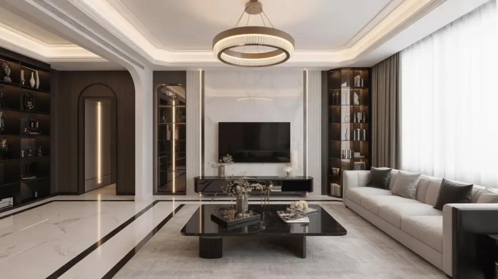 Nothing—and I mean nothing—says luxury quite like marble. A marble and monochrome living room takes the black and white palette to the most elevated level possible. We’re talking about materials that cost more than your monthly rent (or at least look like they do).
