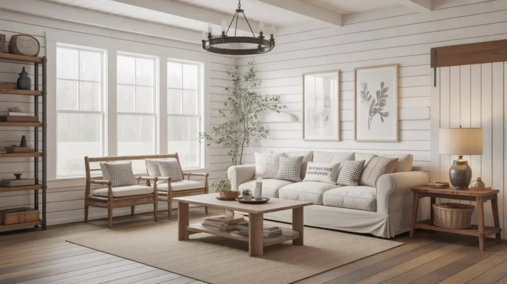 Start with classic farmhouse elements: white shiplap walls (or faux shiplap if you’re renting—peel-and-stick is your friend), exposed white ceiling beams, and plenty of cozy texture. Now bring in the black through wrought iron accents, black window frames (the Joanna Gaines special, you know the ones), and vintage black hardware.