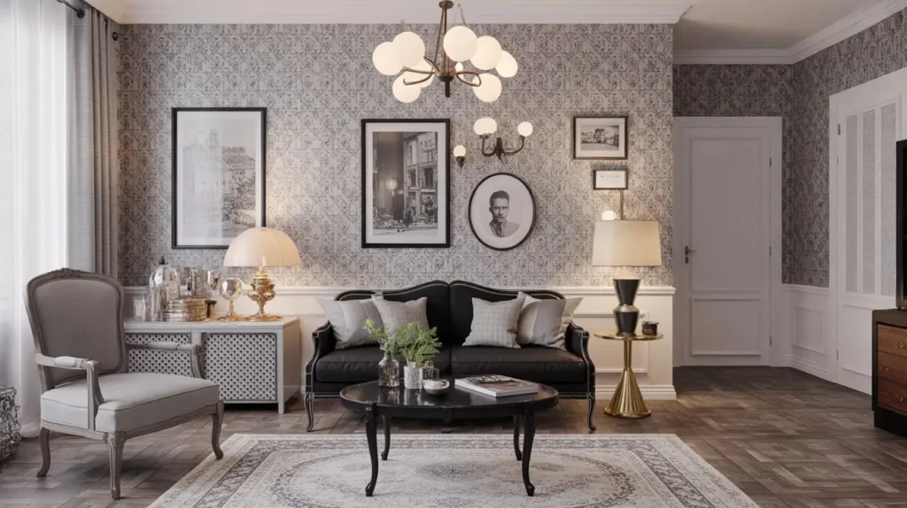 This style loves symmetry and balance. Pair matching black table lamps on either side of your white sofa. Hang identical black-framed art pieces flanking your main focal point. The formality creates a sense of luxury that feels grown-up in the best possible way. Add fresh white flowers in a black vase, and you’ve got yourself a living room that would make interior design legends proud.