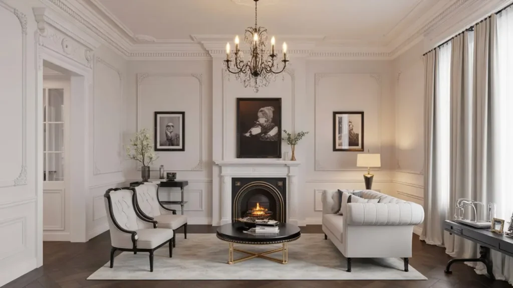 Start with a tufted white velvet sofa—the kind that looks almost too pretty to sit on but feels like a cloud when you do. Pair it with black marble side tables (or faux marble if we’re being budget-conscious, no judgment here). Add gold or brass accents through picture frames, lamp bases, or even a stunning gold-framed mirror that doubles your space visually.