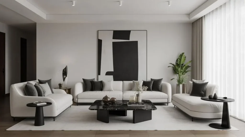 Keep your larger furniture pieces simple and neutral—a white modular sofa, a sleek black coffee table, minimal side tables. Why? Because your walls are about to do all the talking. Invest in (or create, if you’re crafty) bold black and white abstract art, graphic prints, or photography that makes a statement.