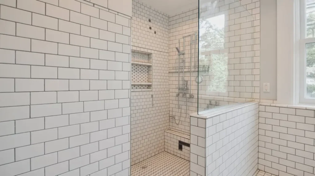 This look instantly elevates a simple tile choice into something that feels custom and architectural. It acts as a frame for your shower, turning it into the bathroom’s focal point. It works with almost any black and white tile combo we’ve discussed, from modern grid lines to classic subway tile, adding a final layer of graphic punch.