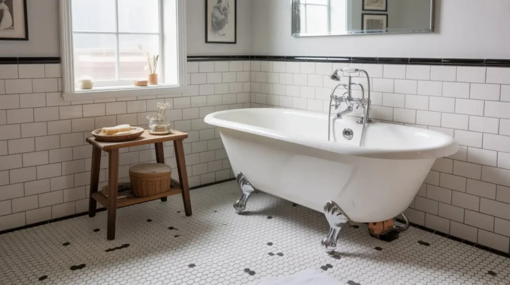 Traditionally, you’ll see small, one-inch hex tiles used for this. You can create a simple black border around the perimeter of the room, or even get creative and spell out a word or create a flower-like pattern in the center of the floor. It’s a nod to early 20th-century design that feels timeless.