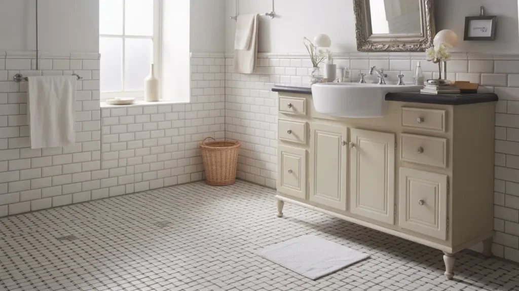 The classic black and white version typically consists of white or off-white “weave” tiles with tiny black “dot” tiles at the intersections. It creates a beautiful, textured look on the floor that feels detailed without being overly busy. It’s the perfect foundation for a bathroom with a pedestal sink and classic chrome fixtures.