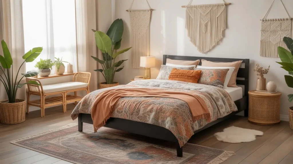 The black bed frame acts as an anchor, preventing the boho chaos from feeling too overwhelming. It provides structure in a space that celebrates creative freedom.