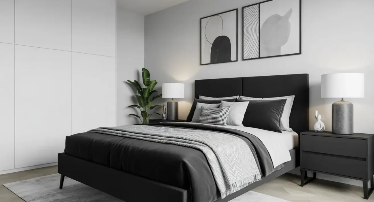 Ready to make a bold statement? A monochrome black and white bedroom delivers high drama and timeless style. Your black bed frame becomes the star of this striking design.