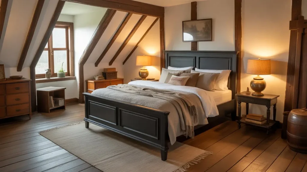 The trick is mixing rustic elements with more refined touches. Pair your black bed frame with reclaimed wood nightstands, a cozy cable-knit throw, and natural fiber rugs. Add modern lighting and clean-lined decor to keep the space from feeling dated.