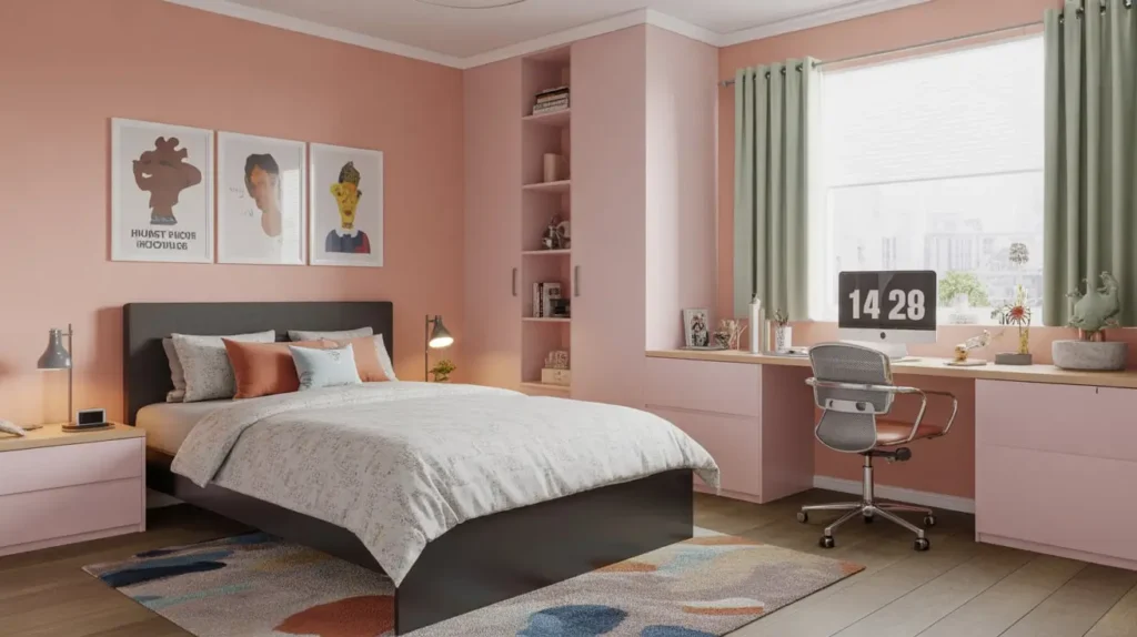 A dark charcoal or deep navy accent wall creates a moody, cocoon-like atmosphere. A soft blush or sage green offers a more subtle contrast. Patterned wallpaper adds personality and becomes a conversation starter.