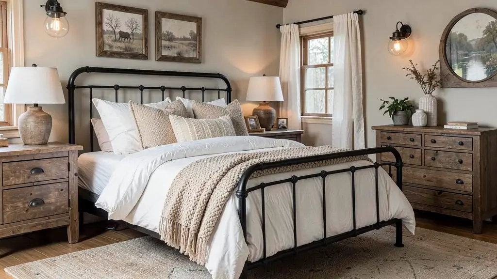 10. Farmhouse Bedroom with Black Metal Bed Frame
