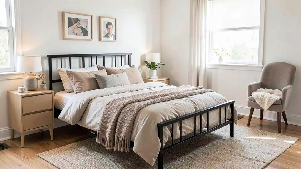 2. Cozy Neutral Bedroom with Black Bed Frame