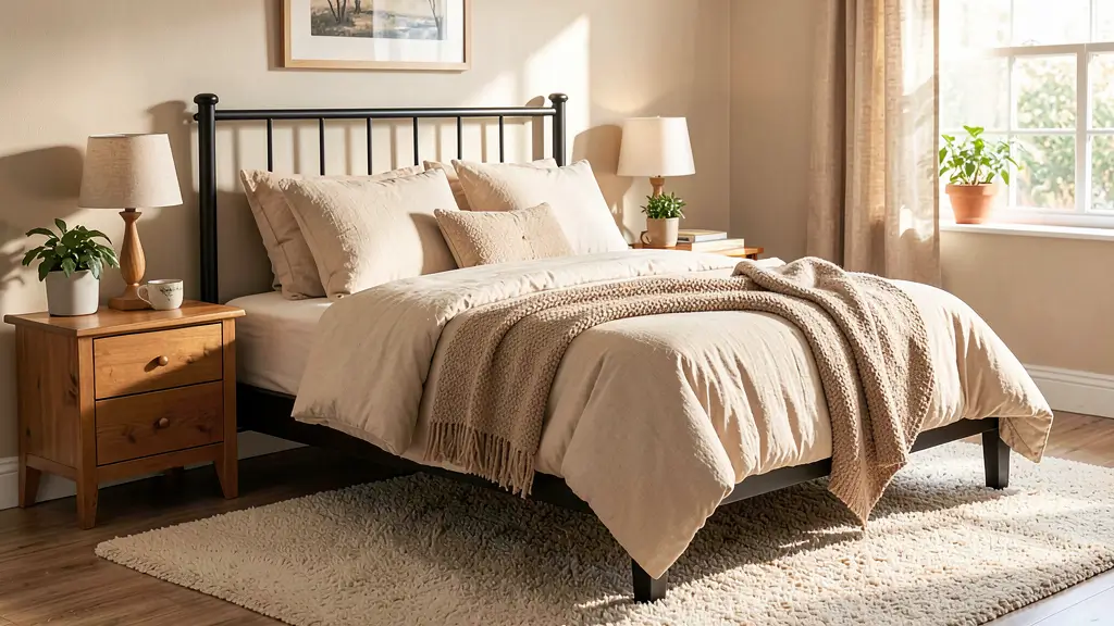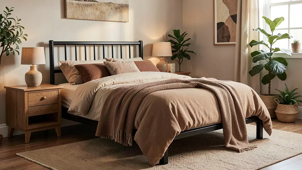 Now, if minimalism feels too cold for you (no judgment—I like my spaces warm too), let me introduce you to the cozy neutral approach. This is where a black bed frame plays beautifully with warm tones to create something that feels like a hug.