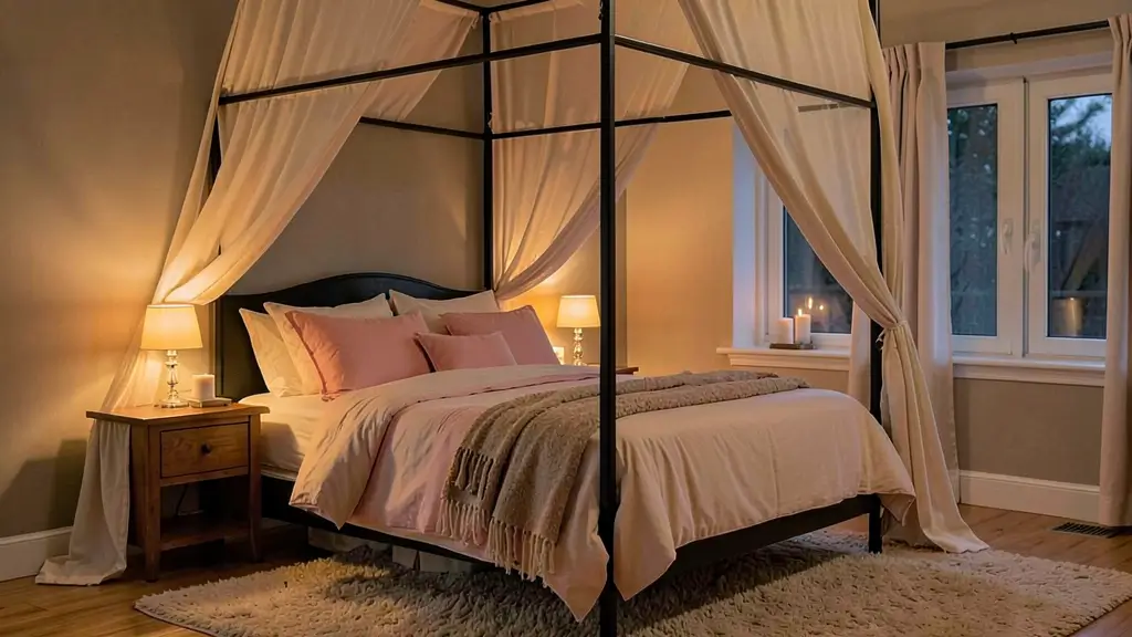 Lighting is crucial here. I use soft, warm lighting—maybe string lights woven through the canopy, bedside lamps with fabric shades, or even candles (safely placed, obviously). The black frame creates definition while the soft fabrics and lighting create romance.