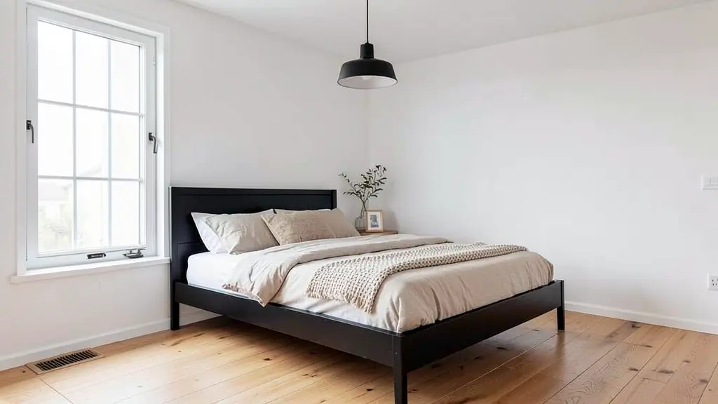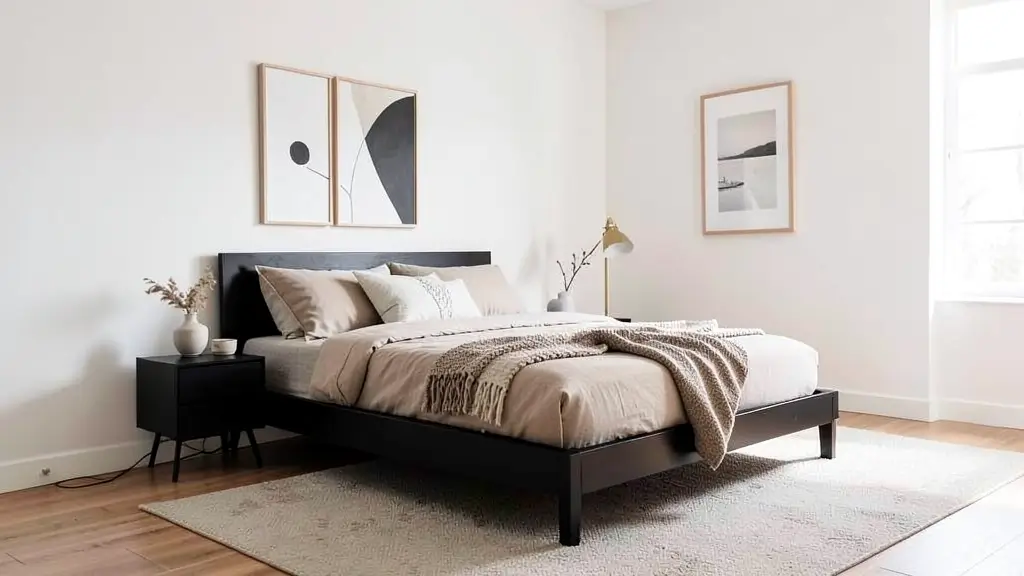 Keep everything neutral and intentional. Your black platform bed should have clean lines—no frills, no unnecessary details. Pair it with neutral bedding in whites, creams, and light grays. Keep your furniture minimal—maybe just a simple nightstand and a floor lamp.