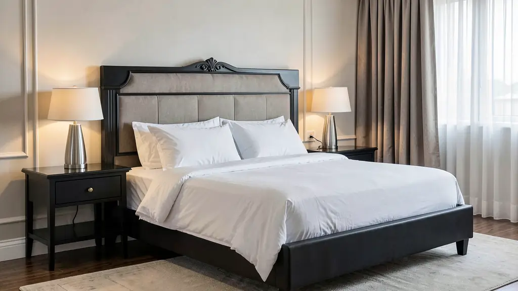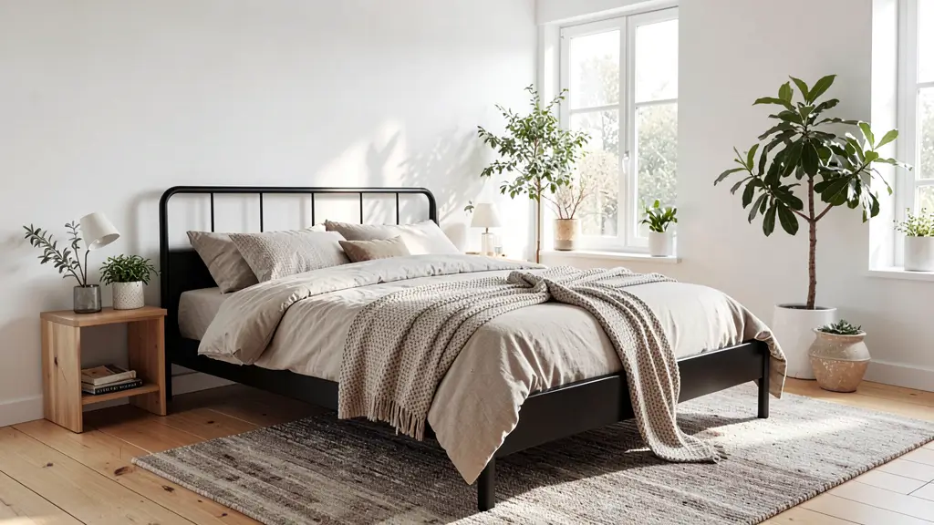 You want clean lines everywhere. Your black bed frame should have a simple silhouette—nothing ornate or fussy. Think straight edges, maybe a low-profile platform style. Pair it with crisp white bedding, and I mean crisp. We’re talking hotel-corner-tucked sheets here.