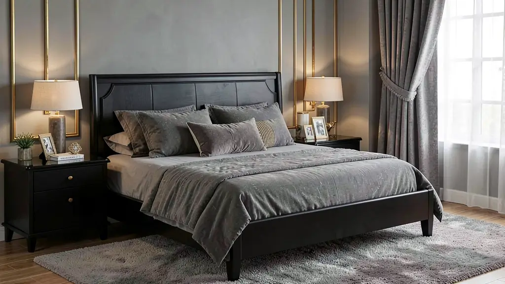 You want an upholstered black bed frame here—think velvet or leather. Pair it with high-thread-count bedding in jewel tones or metallics. I’m talking emerald green, sapphire blue, or champagne gold. The black frame makes these rich colors pop without competing with them.